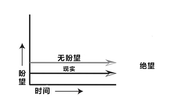 下图显示了:当人陷入绝望时,盼望与现实之间的张力便消失了。绝望在某种奇特的意义上,似乎能带来片刻的安慰;但绝望与它的“近亲”——玩世不恭——却足以扼杀灵魂。